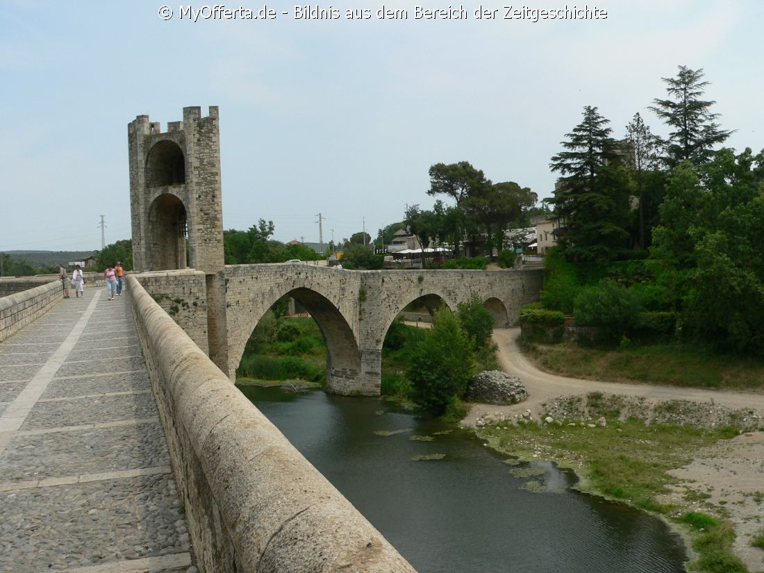 Besalu, zweifellos eine der am besten erhaltenen antiken Staedte Kataloniens, war im Mittelalter ein wichtiger Knotenpunkt. Eine seiner bemerkenswerten Eigenschaften ist die romanische Bruecke aus dem 12. Jahrhundert, die den Fluss Fluvia ueberquert. Die schmalen Backsteinstrassen der Stadt schaffen eine einzigartige romantische Atmosphaere und viele schoene Terrassen ermoeglichen es Ihnen, die Atmosphaere zu geniessen. Foto: Marek Walczak, alle Rechte vorbehalten! |