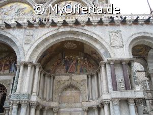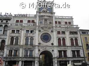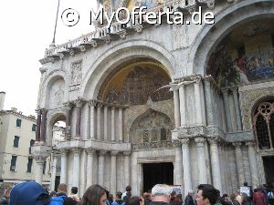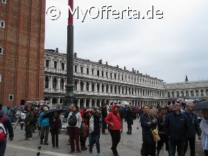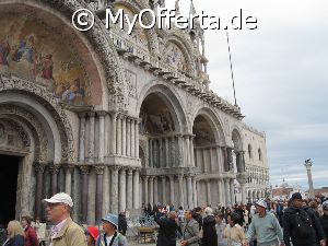 Punta Sabbioni ist ein wichtiger Faehrhafen fuer die Wasserbusse von Venedig. Der Hafen liegt auf dem Festland auf einer Halbinsel. Er wird vor allem von Touristen genutzt, die in oder um den Badeort Lido di Jesolo oder Cavallino ihren Urlaub verbringen und eines Tagesausflug nach Venedig machen. Sogenannte Wasserbusse oder Vaporetti (Personenfaehren) bringen in der Saison taeglich viele tausend Touristen von Punta Sabbioni in etwa 30 Minuten direkt ins Zentrum der Altstadt von Venedig nahe dem Markusplatz. Die zwei wichtigsten Gebaeude am Platz sind der Dogenpalast und der Markusdom. Ein weiteres wichtiges Bauwerk ist der Markusturm, das Wahrzeichen von Venedig. Die beruehmte Wasserstrasse von Venedig Canale Grande muendet unweit des Platzes Piazza San Marco ins Meer. Beruehmt ist der Platz heute auch fuer luxurioese Restaurants und Cafes, Tauben und Hochwasser. Foto: Dipl.-Ing. Marek Walczak, alle Rechte vorbehalten!