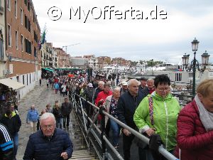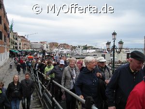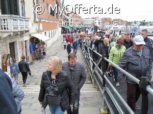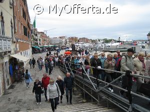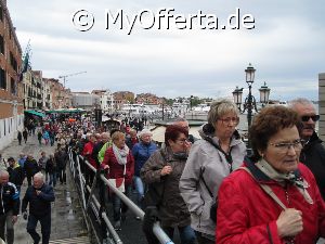 Punta Sabbioni ist ein wichtiger Faehrhafen fuer die Wasserbusse von Venedig. Der Hafen liegt auf dem Festland auf einer Halbinsel. Er wird vor allem von Touristen genutzt, die in oder um den Badeort Lido di Jesolo oder Cavallino ihren Urlaub verbringen und eines Tagesausflug nach Venedig machen. Sogenannte Wasserbusse oder Vaporetti (Personenfaehren) bringen in der Saison taeglich viele tausend Touristen von Punta Sabbioni in etwa 30 Minuten direkt ins Zentrum der Altstadt von Venedig nahe dem Markusplatz. Die zwei wichtigsten Gebaeude am Platz sind der Dogenpalast und der Markusdom. Ein weiteres wichtiges Bauwerk ist der Markusturm, das Wahrzeichen von Venedig. Die beruehmte Wasserstrasse von Venedig Canale Grande muendet unweit des Platzes Piazza San Marco ins Meer. Beruehmt ist der Platz heute auch fuer luxurioese Restaurants und Cafes, Tauben und Hochwasser. Foto: Dipl.-Ing. Marek Walczak, alle Rechte vorbehalten!