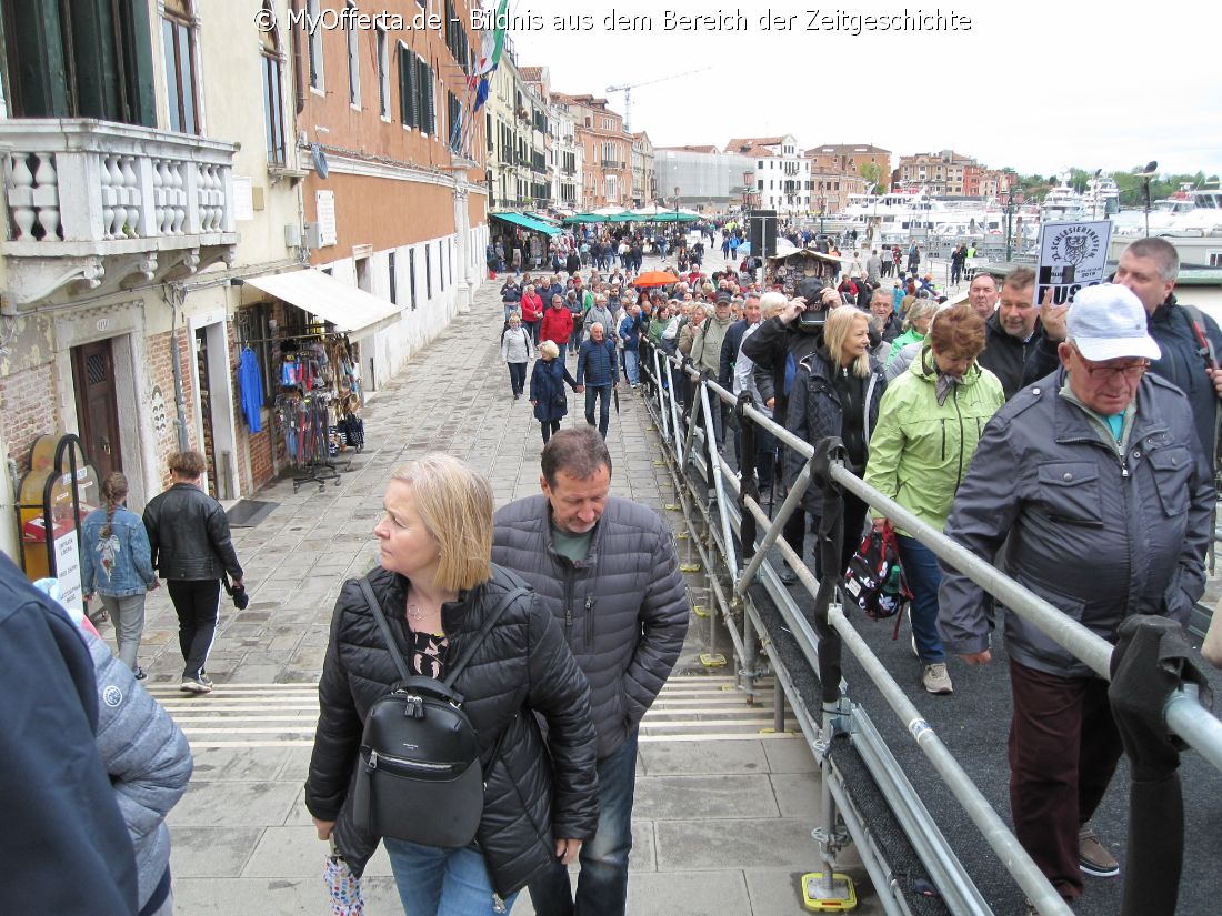 Punta Sabbioni ist ein wichtiger Faehrhafen fuer die Wasserbusse von Venedig. Der Hafen liegt auf dem Festland auf einer Halbinsel. Er wird vor allem von Touristen genutzt, die in oder um den Badeort Lido di Jesolo oder Cavallino ihren Urlaub verbringen und eines Tagesausflug nach Venedig machen. Sogenannte Wasserbusse oder Vaporetti (Personenfaehren) bringen in der Saison taeglich viele tausend Touristen von Punta Sabbioni in etwa 30 Minuten direkt ins Zentrum der Altstadt von Venedig nahe dem Markusplatz. Die zwei wichtigsten Gebaeude am Platz sind der Dogenpalast und der Markusdom. Ein weiteres wichtiges Bauwerk ist der Markusturm, das Wahrzeichen von Venedig. Die beruehmte Wasserstrasse von Venedig Canale Grande muendet unweit des Platzes Piazza San Marco ins Meer. Beruehmt ist der Platz heute auch fuer luxurioese Restaurants und Cafes, Tauben und Hochwasser. Foto: Dipl.-Ing. Marek Walczak, alle Rechte vorbehalten! |