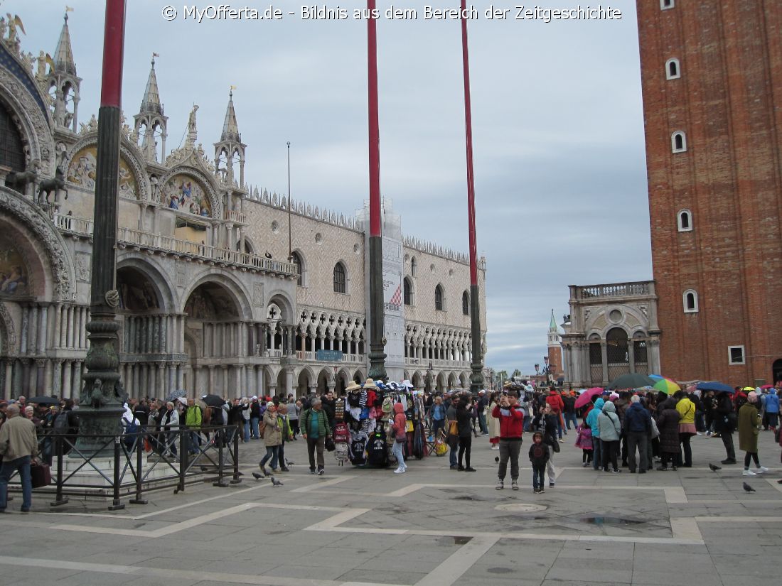 Punta Sabbioni ist ein wichtiger Faehrhafen fuer die Wasserbusse von Venedig. Der Hafen liegt auf dem Festland auf einer Halbinsel. Er wird vor allem von Touristen genutzt, die in oder um den Badeort Lido di Jesolo oder Cavallino ihren Urlaub verbringen und eines Tagesausflug nach Venedig machen. Sogenannte Wasserbusse oder Vaporetti (Personenfaehren) bringen in der Saison taeglich viele tausend Touristen von Punta Sabbioni in etwa 30 Minuten direkt ins Zentrum der Altstadt von Venedig nahe dem Markusplatz. Die zwei wichtigsten Gebaeude am Platz sind der Dogenpalast und der Markusdom. Ein weiteres wichtiges Bauwerk ist der Markusturm, das Wahrzeichen von Venedig. Die beruehmte Wasserstrasse von Venedig Canale Grande muendet unweit des Platzes Piazza San Marco ins Meer. Beruehmt ist der Platz heute auch fuer luxurioese Restaurants und Cafes, Tauben und Hochwasser. Foto: Dipl.-Ing. Marek Walczak, alle Rechte vorbehalten! |